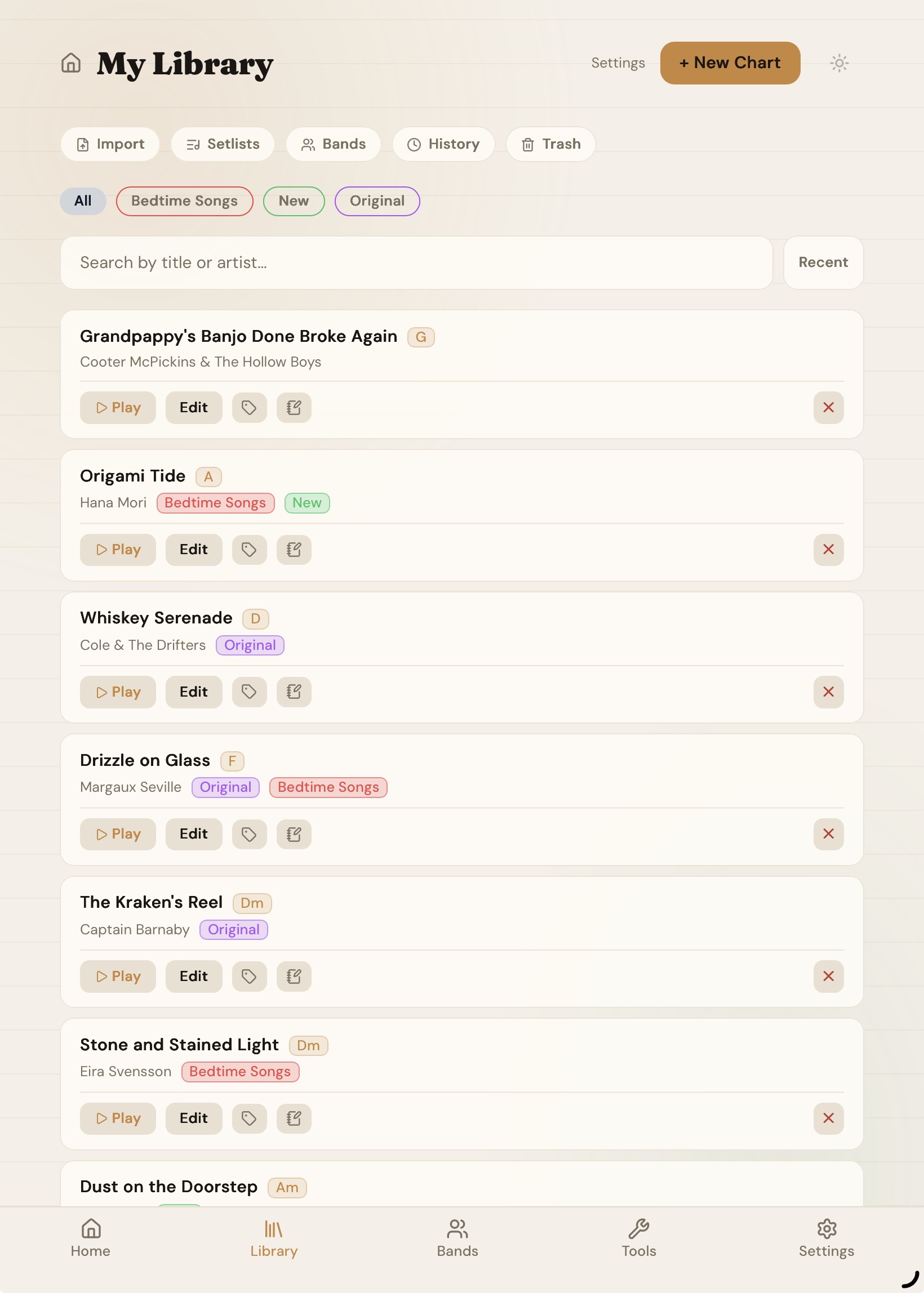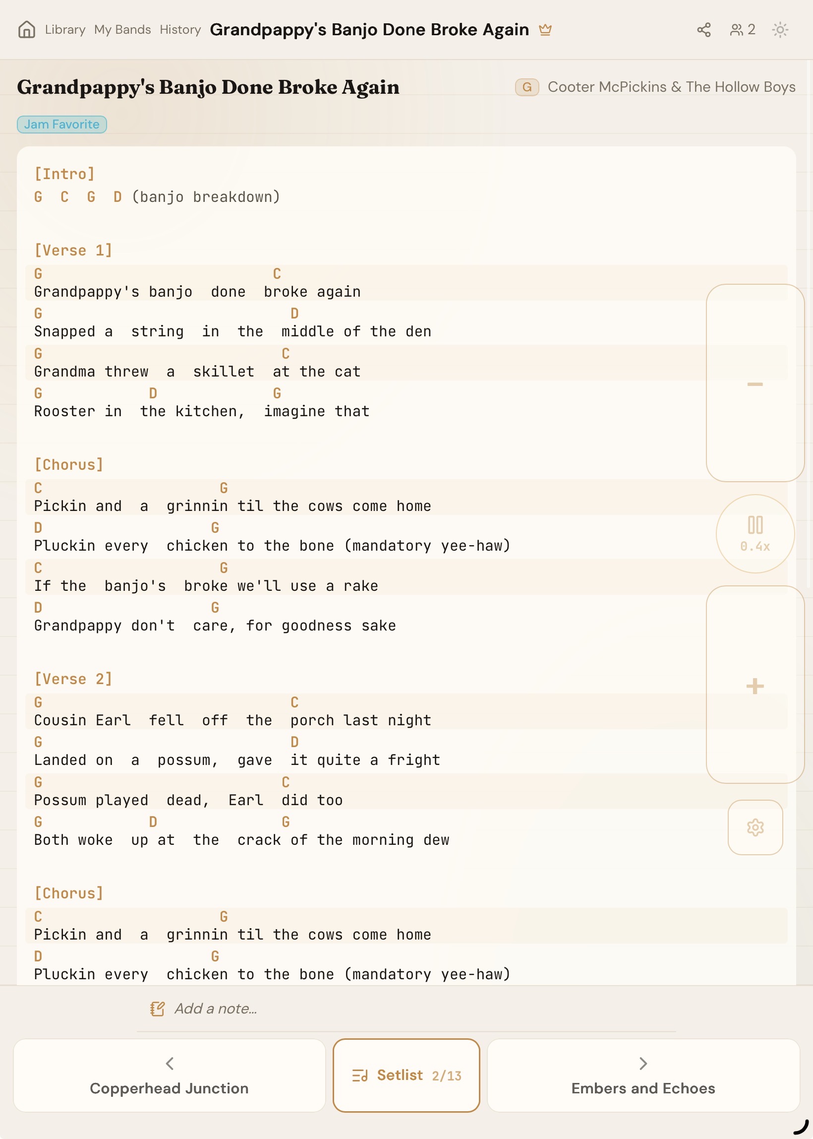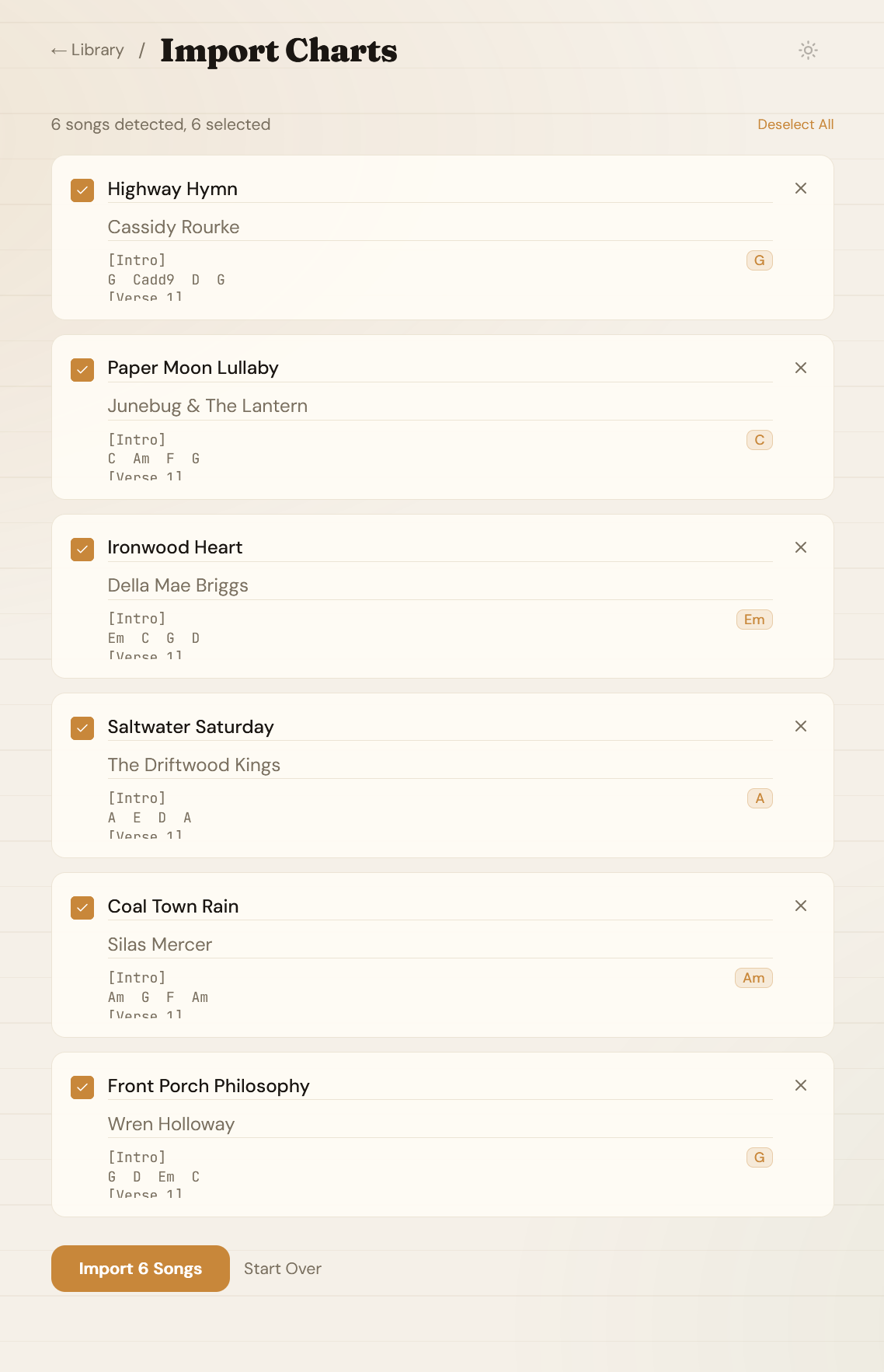 Paste a chord chart or drop a songbook PDF. We split it into individual songs.