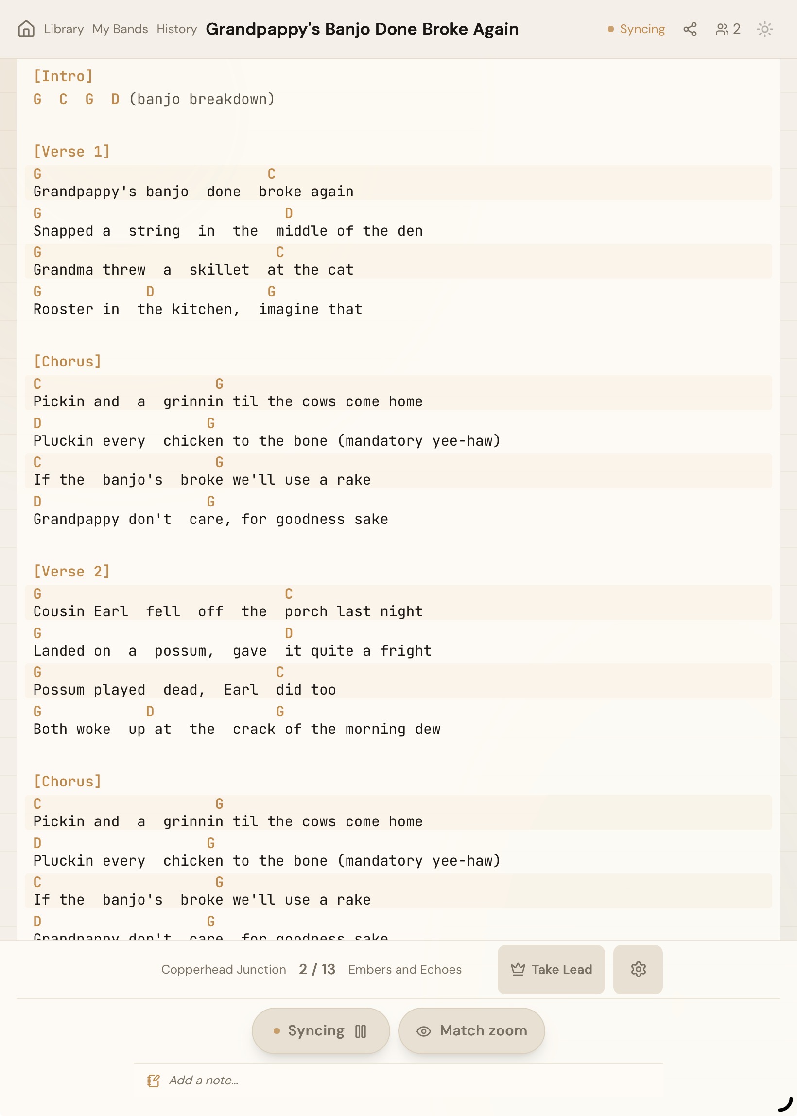 Broadcast your chord charts, everyone scrolls in unison, anyone can join with a code.